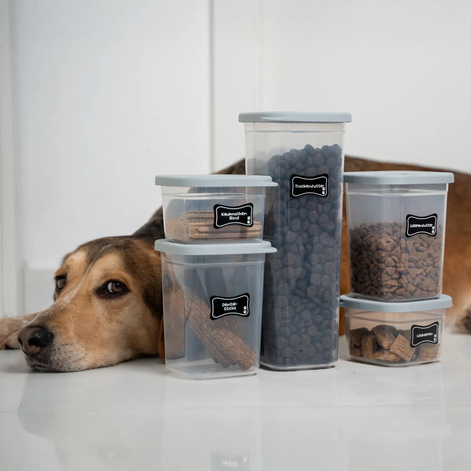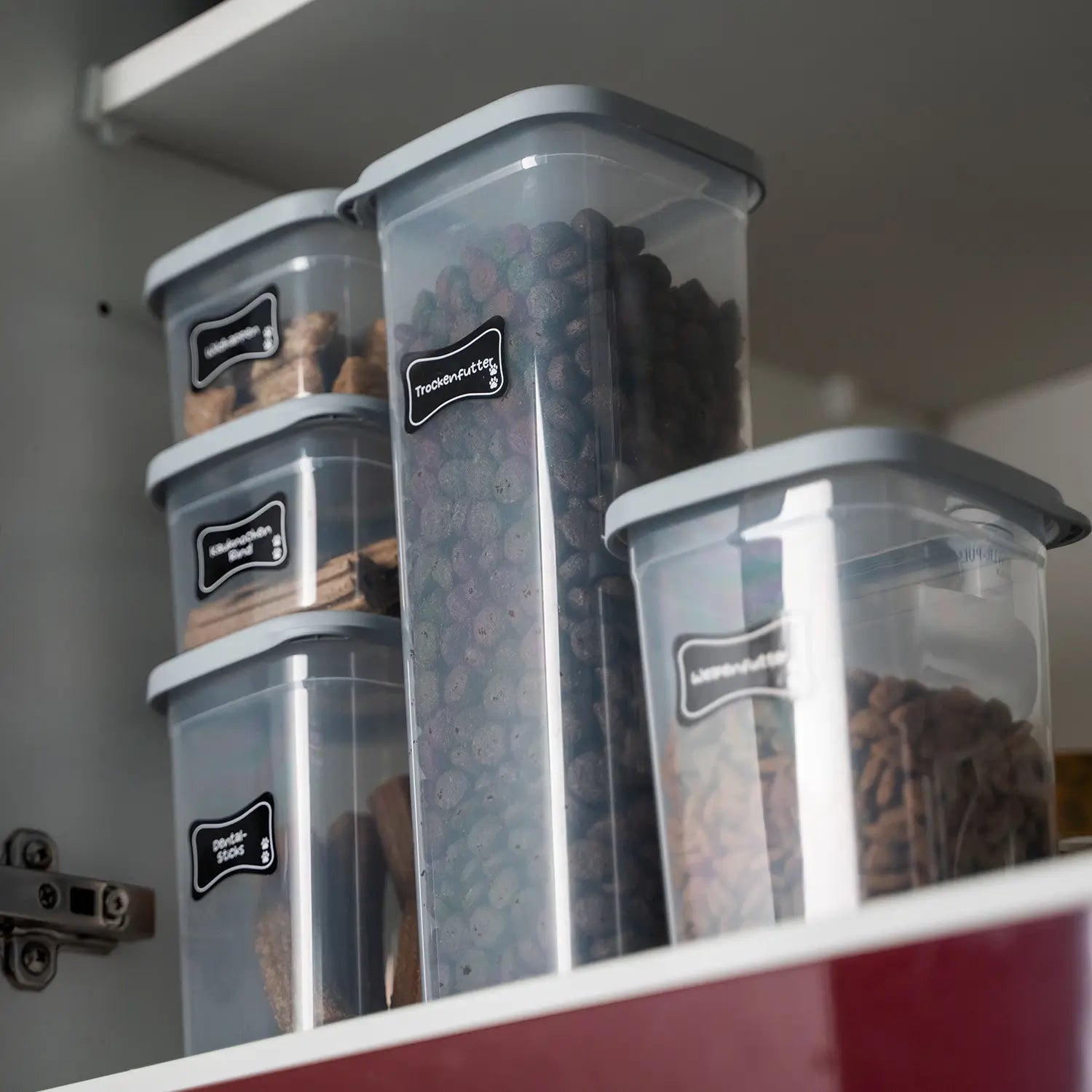 Die luftdichten Qoona-Dosen halten deine Futtervorräte frisch und die störenden Gerüche fern, während die Etiketten für eine übersichtliche Beschriftung sorgen. So hast du immer den perfekten Überblick – funktional und optisch ein echtes Dream-Team!